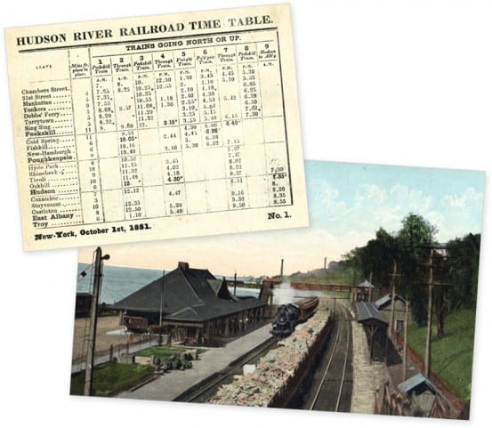 A postcard of Dobbs Ferry station, and a portion of a Hudson River Railroad timetable from 1851, listing Dobbs Ferry station