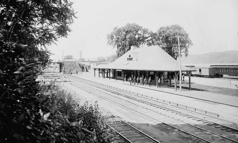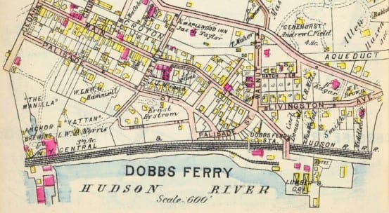 A 1914 map of Dobbs Ferry, depicting both the railroad and the river. Note the railroad sidings that are no longer present today.
