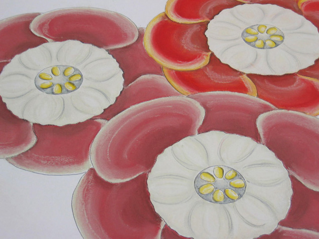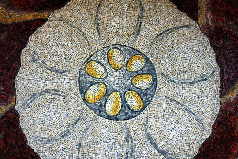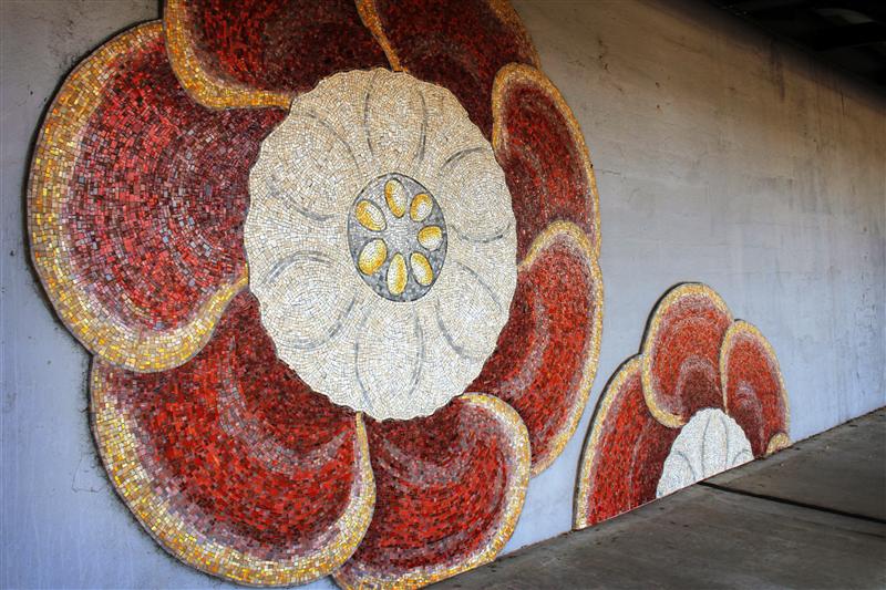 Thanks to Blum’s website, we get a lovely view of the progression of an Arts for Transit piece – from an original painting, all the way to the finished mosaic on the station platform. The first four photos above are from the artist’s site, the remainder (above and below) are mine.