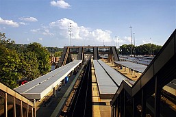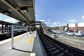 As I mentioned last week, today’s stop on our Tuesday Tour is one of the least attractive stations on the Hudson Line, Croton-Harmon. You have to have mixed feelings about this place, because despite not looking all that spectacular, there’s a lot of action going on here. Not only does Croton-Harmon serve Metro-North, Amtrak has several trains which stop here. The station is also the northern terminus of electric service on the Hudson Line, and although Metro-North offers many through trains, some passengers still have to transfer here, so it is definitely a busy station (in the past fewer through trains were available, thus transferring here was a must). Metro-North’s Croton-Harmon shops, which recently won a Brunel Award, are also here, which certainly adds to the action.