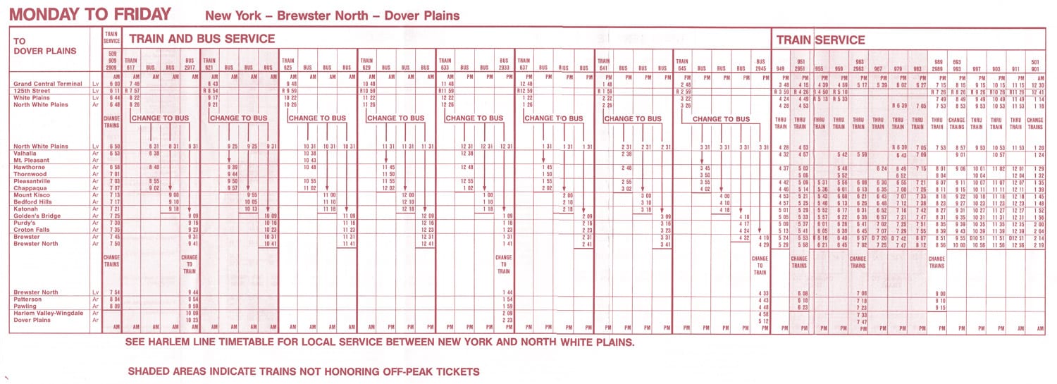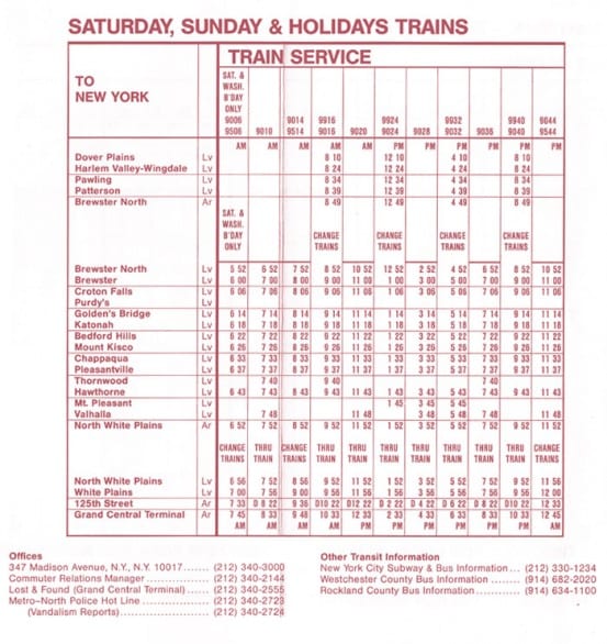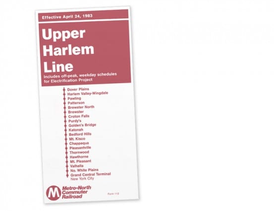 Blue ink on white paper eventually became the standard for Harlem timetables, though there were a few times over the years where the rules were totally broken. One of the most odd was an early timetable printed by Metro-North in 1983 – in maroon ink. I have no idea why anyone would have thought to print a Harlem Line timetable in maroon – my only assumption is that it was to catch people’s attention as it highlighted the electrification project underway north of White Plains.