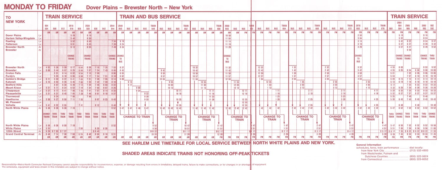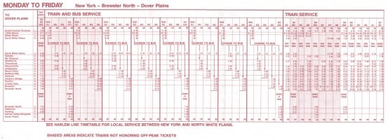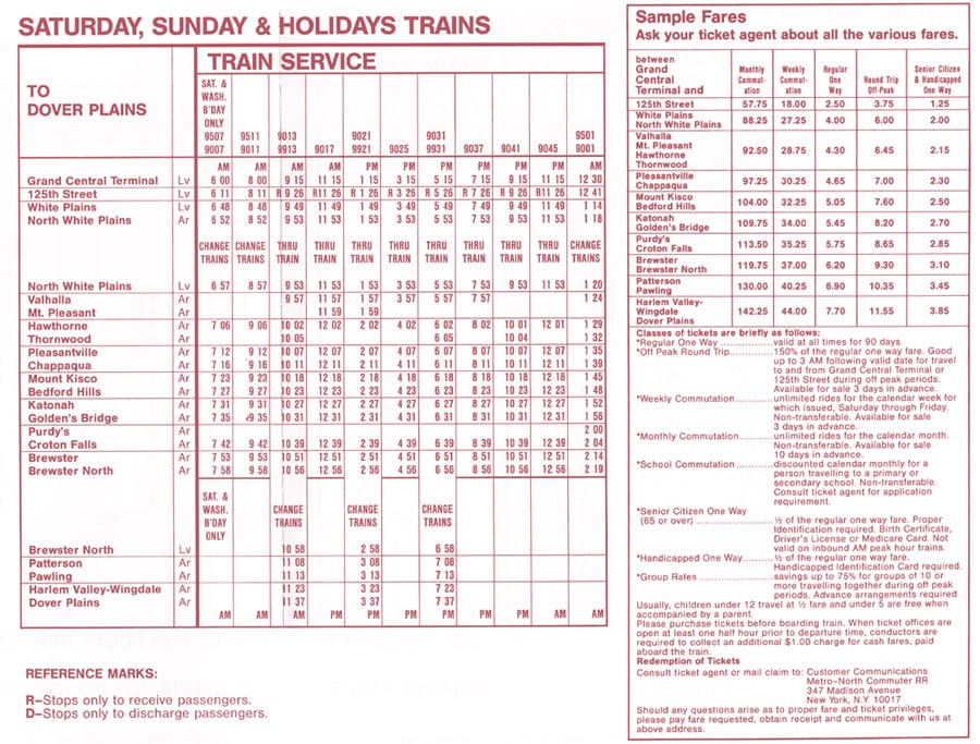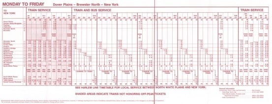 Below is the rest of the timetable, which is a bit interesting to see… especially the listing of the fares when Metro-North took over from Conrail in 1983.