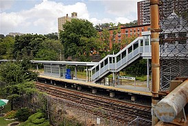 Today our Tuesday Tour takes us southward on the Hudson Line to Morris Heights station in the Bronx. The station is sandwiched in between the Major Deegan Expressway and Roberto Clemente State Park, which itself borders the Harlem River. Morris Heights station consists of an island platform, with a set of stairs that connect it to street level. Enclosed in a bus station style shelter at street level is a single ticket vending machine. It is a relatively low-traffic station – excluding limited-service stations, Morris Heights gets the second fewest number of daily passengers on the Hudson Line.