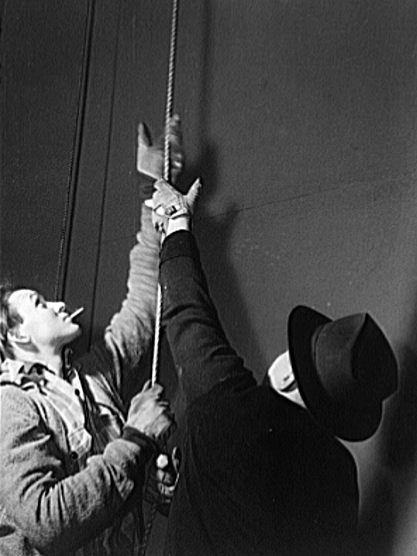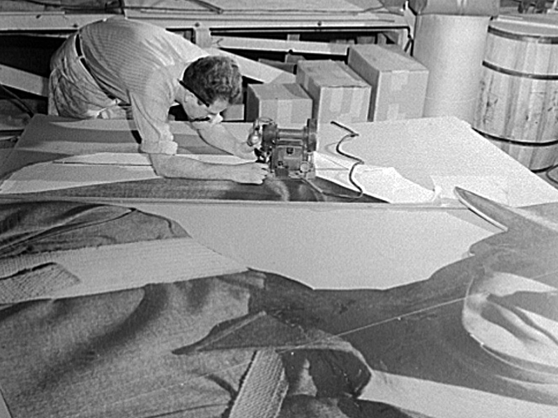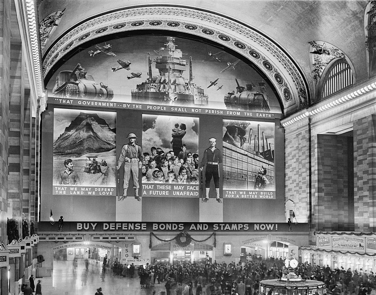 Scant months after the above two sets of photos were taken, the large east windows of the Terminal were completely covered with a massive photo mural paid for by the Treasury and advertising war bonds and stamps. The mural not only used photos from the Farm Security Administration’s collection, but was documented from start to finish by the FSA photographers. Dedicated in December of 1941, the mural was claimed to be the largest photo mural in the world, measuring 96 by 118 feet.