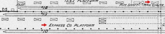 • Confirming the premise that tracks east of the main concourse were reserved for mail and freight, plans for Grand Central call for a mail chute between tracks 14 and 15, and the platform by tracks 10 and 13 was reserved for the [American] Express Company. Some tracks on the east end of the lower level were also reserved for mail.