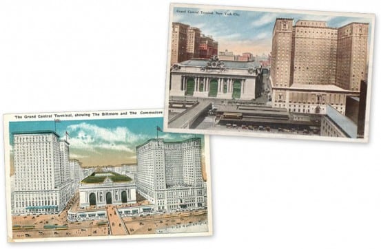 Part of the reason I find these postcards so interesting is that they are a great way to see how Grand Central has changed over the past 100 years. Many buildings sprang up around the Terminal – most notably in 1929 when the New York Central building was constructed behind, and in 1958 when construction commenced on the Pan Am building. But perhaps most notable are the cards that show what everyone thought Grand Central would look like. Several of the postcards were printed before Grand Central was ever completed – and one even imagined the inside of the Terminal with a glass ceiling, not the painted sky ceiling we are all familiar with (which did appear in an early Warren & Wetmore sketch).
