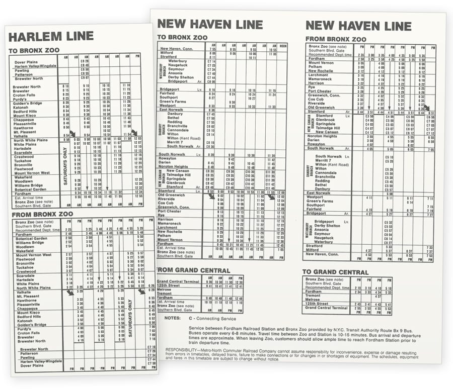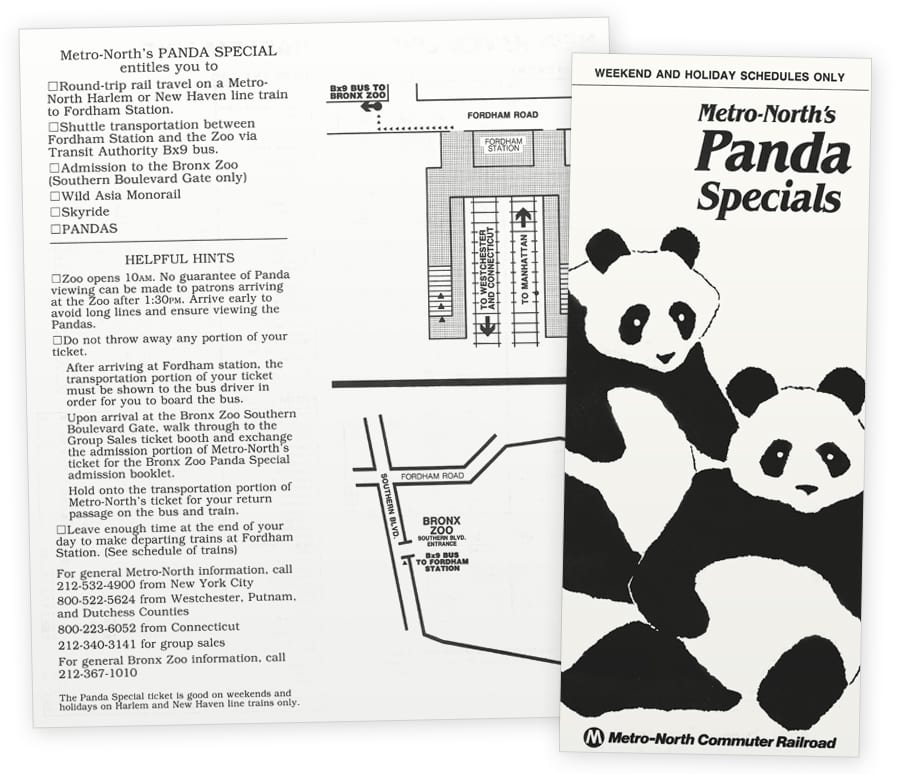 Now Mayor Koch and two adorable pandas certainly make a good story, but I’m sure you’re wondering how exactly this relates to trains. Apparently the pandas whipped everyone into quite a fervor – the zoo expected 1800 visitors would see them an hour – and not everyone would arrive by car. For those that opted for public transportation, Metro-North not only offered special tickets to the zoo, they printed special timetables as well. Appropriately printed in black and white ink, the timetables featured two pandas on the front, and included a map for getting to the zoo. The illustration of the pandas was done by Victor Chan, who was a graphic designer in Corporate Communications for Metro-North in the late ’80s.