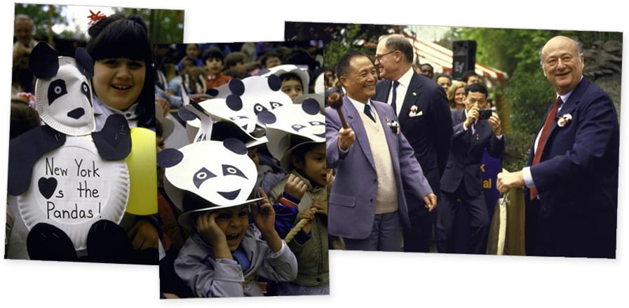 Everyone is excited for the pandas on opening day! Children visit the zoo with masks and signs, and Mayor Koch stands with Deputy Mayor of Beijing, Feng Mingwei.