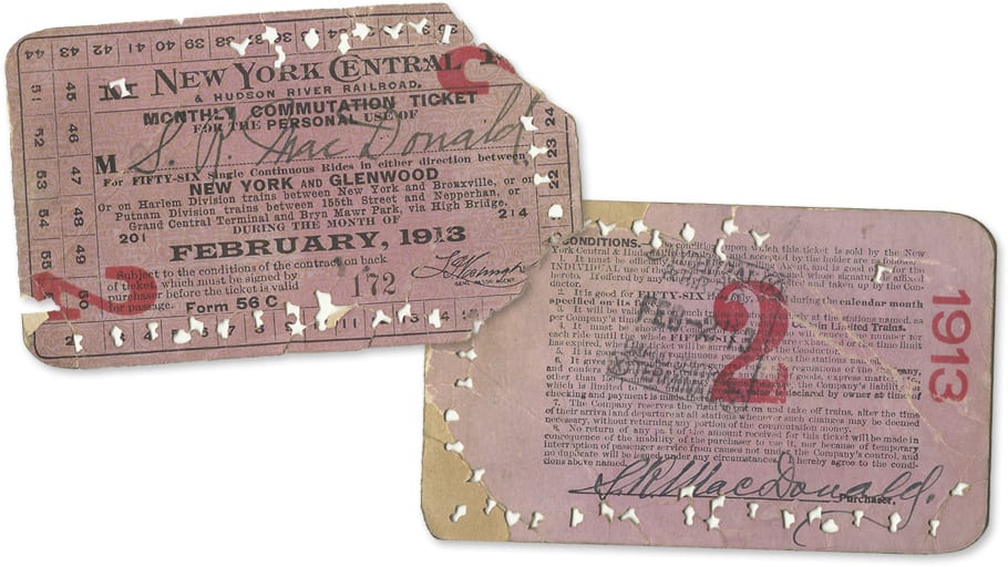 My favorite monthly ticket – note the date that it was purchased. February 2nd, 1913 was the day Grand Central Terminal opened to the public. This type of ticket had boxes surrounding it, which the conductor clipped with each ride.
