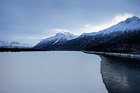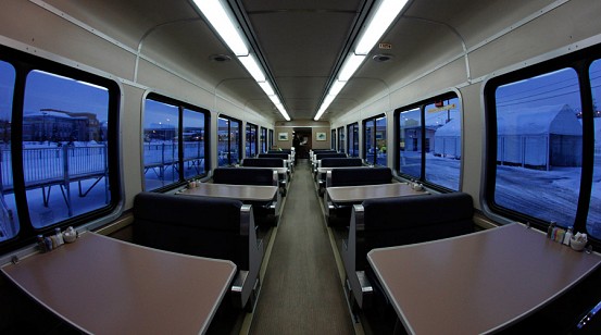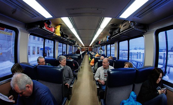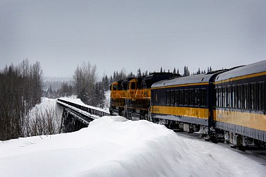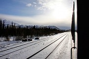 As you see from the map, different trains are offered in the winter and the summer, and my trip included a trip on the Winter Aurora train. Running weekly in either direction, the train takes around twelve hours and travels from Anchorage to Fairbanks. Besides a baggage car and several passenger cars, the train contains a dining car that serves up hot meals. The first half of the journey I took passed through Wasilla and Talkeetna, and passes over the 558-foot long Hurricane Gulch arch bridge. The below photos are from the first half of the trip – we’ll continue the journey, and learn a bit more about the Alaska Railroad, in Part 2.