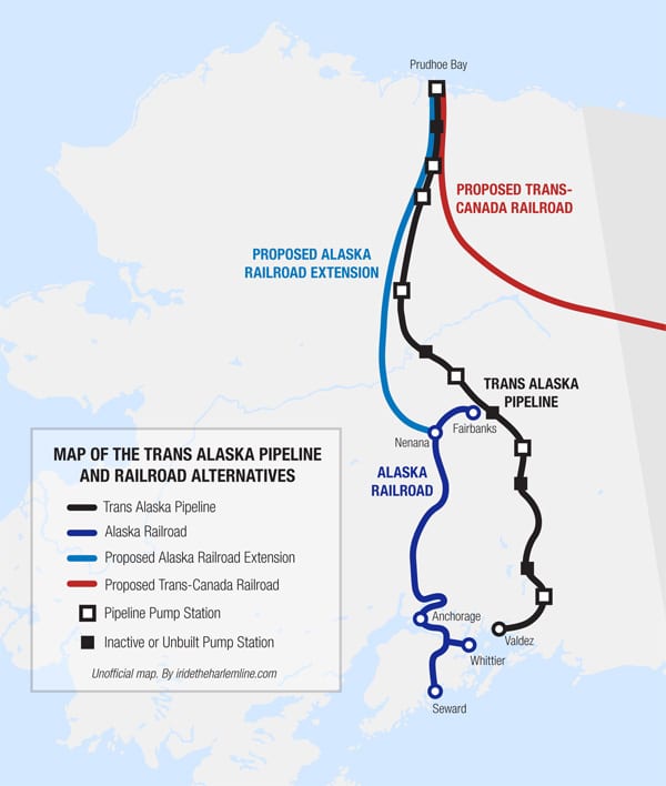 In our previous post regarding Alaska, we traveled the Dalton Highway up into the Arctic Circle, a route that for the most part parallels the Trans Alaska Pipeline. The interesting thing to note about the Highway is that there could have been a railroad here too, and possibly instead of the Pipeline. After the discovery of oil in Prudhoe Bay in 1968, the problem was how exactly to get this oil out of such a remote location. Prudhoe Bay is in the far north of Alaska, and ocean access is hindered by ice – a fact that assured whichever method of transportation was chosen, it wouldn’t be easy. Besides the pipeline, highway tankers, submarines fortified to navigate the icy waters, air tankers, and the railroad were all possible solutions to the problem.