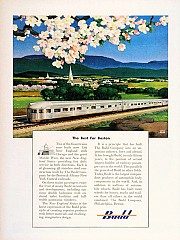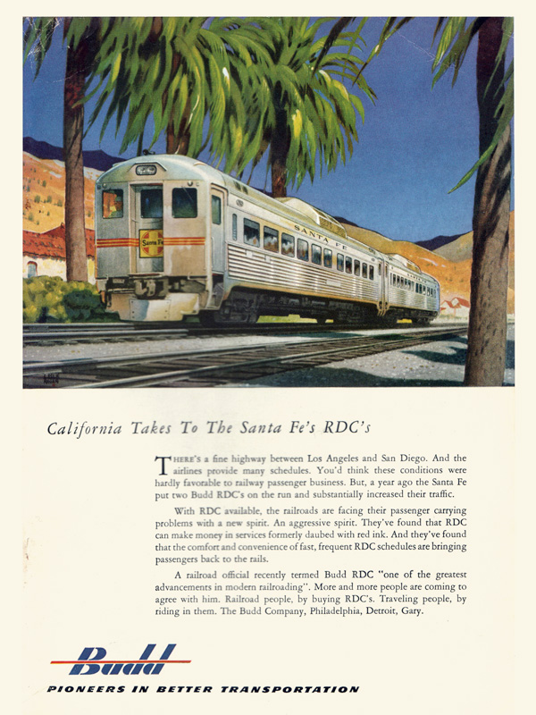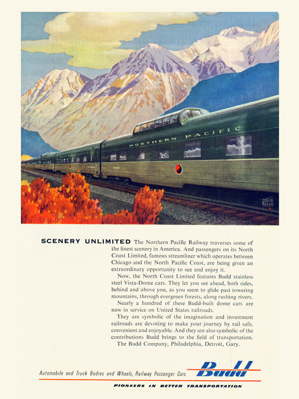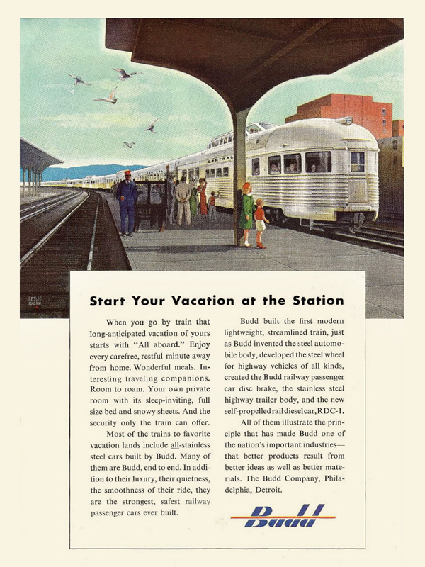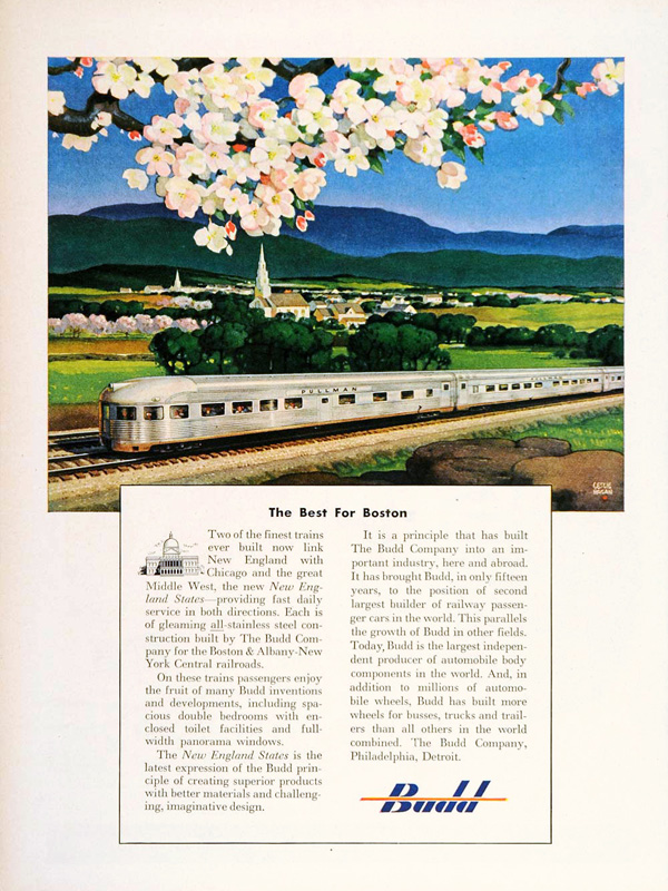 Now if you’re familiar with the blog, you may remember that I’ve already profiled Ragan, and have already gone on record with how much I love his paintings. Ragan did quite a bit of work for the New York Central, and some of it was featured on system timetables during World War II and the ensuing years. Of course Ragan didn’t work solely for the Central – he created works for a wide variety of companies and organizations – including the Seaboard Railway, the United Nations, and even the Woman’s Home Companion. But perhaps Ragan’s largest body of work were the paintings he did for the Budd Company, and used for many of their ads in the 1950’s. And it was one of those ads that seemed decidedly Spring-like, and inspired this post.