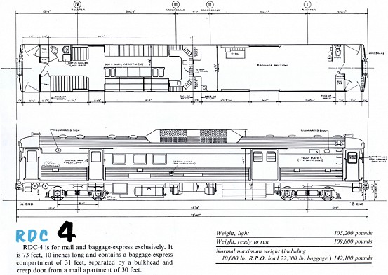 The first RDC’s were offered in four different models, numbered 1 through 4. The RDC-1 was for passengers only, and seated 89. The RDC-2 seated 70 passengers, and had a 17 foot baggage compartment. The RDC-3 combined passenger seating with baggage and mail, it accommodated 48 passengers, a 17 foot baggage compartment, and a 15 foot mail apartment. The RDC-4 carried no passengers, and had a baggage compartment measuring 31 feet, and a mail apartment 30 feet long. Ever curious what the first four versions looked like? Here are the schematics, which were published by the Budd Company in a 1953 promotional booklet called “RDC Comes of Age.”