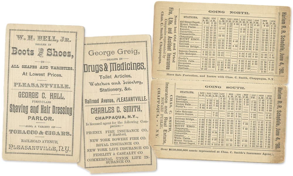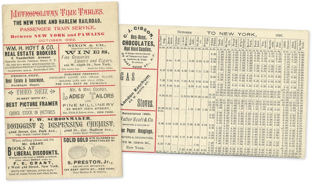Train timecard from Pawling, 1892. A bifold card, the outside features advertisements for numerous businesses. In featuring only weekday trains, the card is tailored to the businessman that would likely patronize the featured establishments. For those looking for Sunday trains, the card advises to consult an official timetable “of the road.”