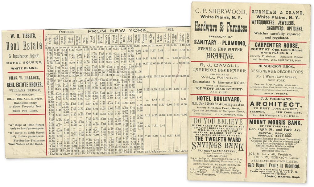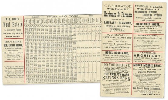 Timecard from 1890, featuring selected stops along the Harlem, all the way up to Chatham. Also a bifold, this card is likely more successful than the unwieldy one above, as it would easily fit into your pocket.
