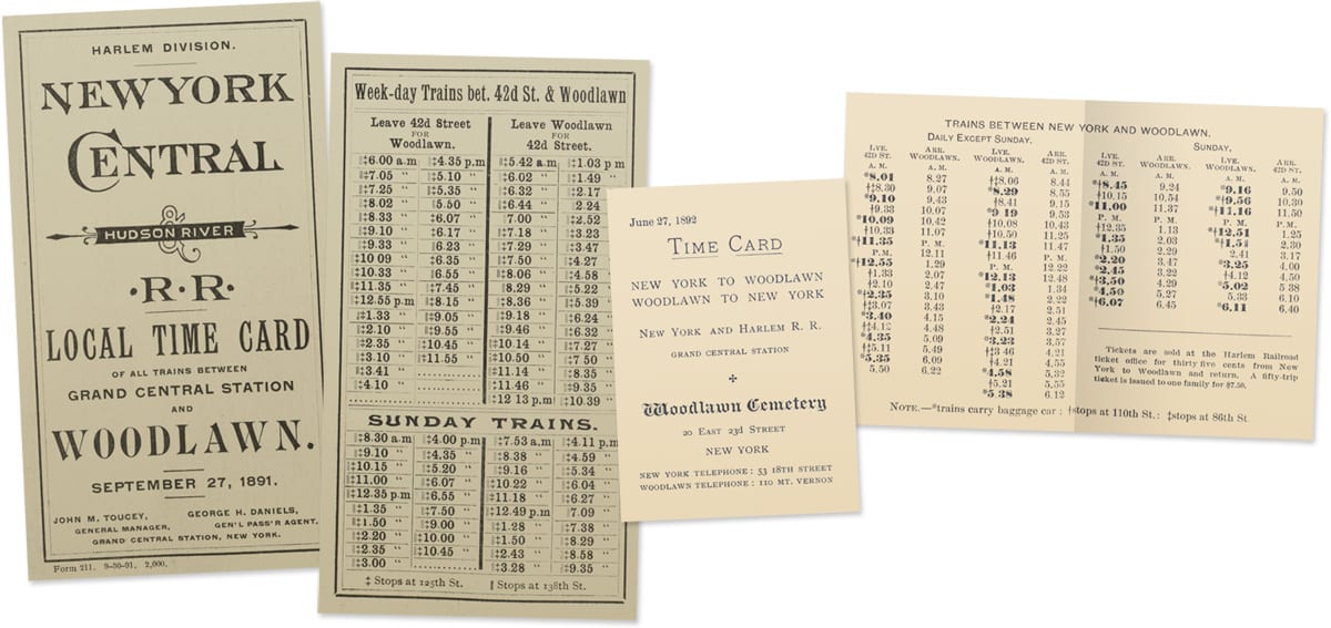 Timecards from Woodlawn. The 1891 card at left is official and printed by the railroad. The 1892 card at right was printed by the Woodlawn Cemetery.