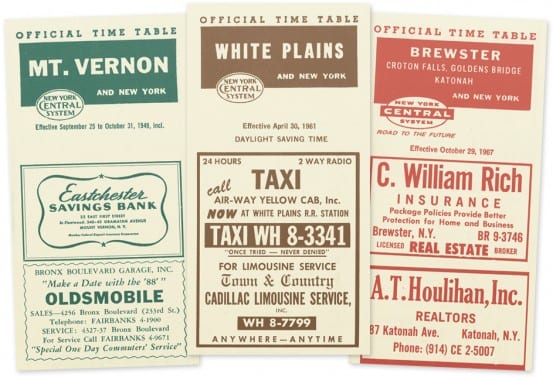 Eventually, local timetables did become standardized – printed by the railroad, but still containing advertisements. Below is a nice collection of some local timetables throughout the years. Make sure you note an important portion of the design – the top of every New York Central local timetable is labeled as “official.” By the time the Penn Central came into being, this disclaimer was dropped. Also in the mix is a more current version of Metro-North’s local timetable. The new design still contains advertisements, but they’ve been relegated to the inside.