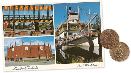 Postcard from Alaskaland, and token from the centennial exposition.