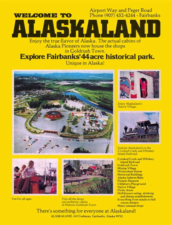 1981 brochure for Alaskaland, including an aerial view of the railroad tracks encircling the park.