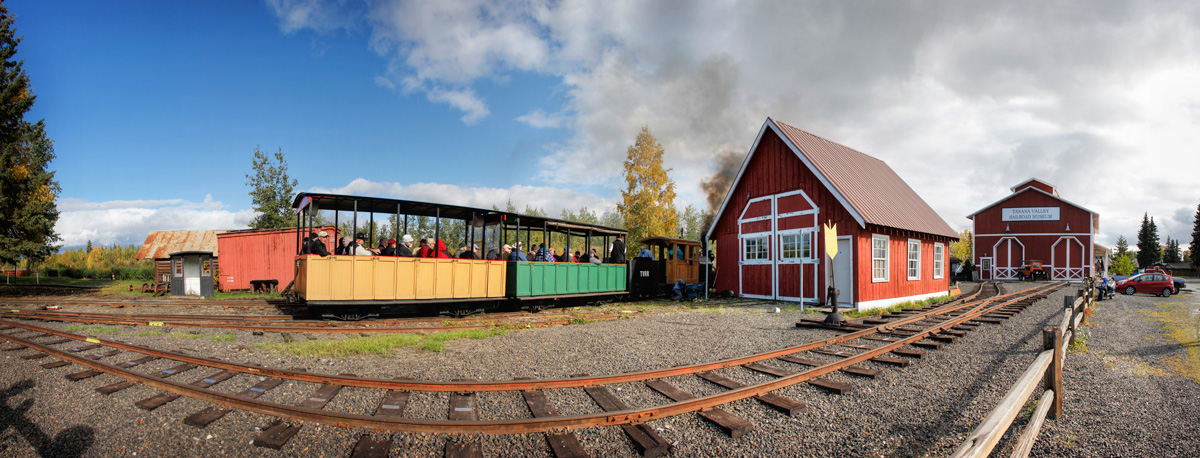Before I continue with a long series of photos and videos from the Alaska Railroad, I figured it would be fun to quickly introduce everyone to the Tanana Valley Railroad Museum, located in Fairbanks, Alaska. Located in Pioneer Park, the museum operates a historic 1899 steam locomotive a few times a year for visitors. Built in 2005, the museum consists of a shop for the locomotive, and a smaller section for displays, all of which is staffed by volunteers. The museum was one of the very first stops for the NRHS convention, and the historic locomotive was operating all afternoon, and a night photo session was held in the evening.