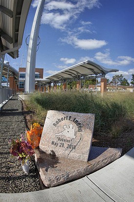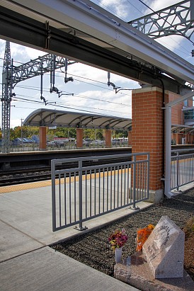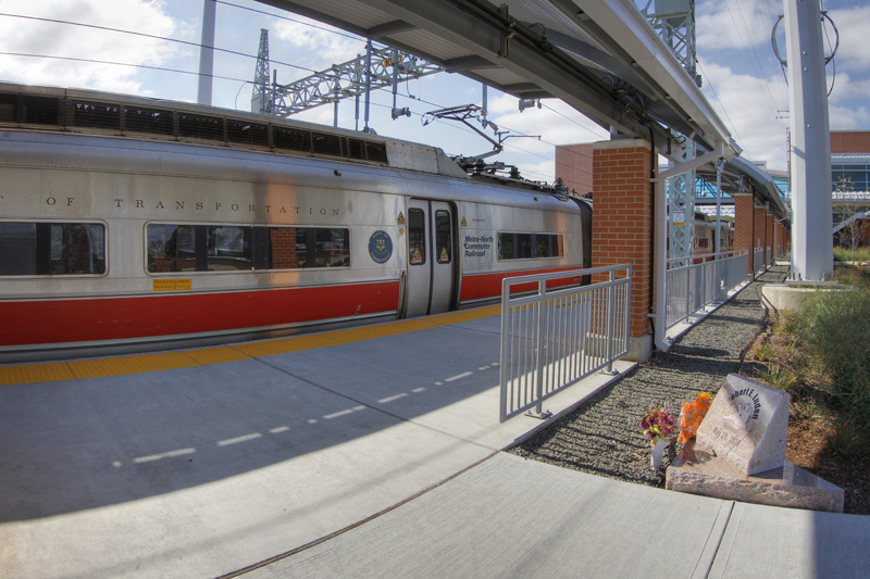 If you read our most recent Tuesday Tour to Metro-North’s newest station in West Haven, you may recall that I said that it would be appropriate if the the station were to have something commemorating the life of Robert Luden. Luden was the track foreman killed in May near the station’s construction site. I was not alone in my thought, as several weeks after my visit a memorial was placed, and a small ceremony held on the 20th of September. Luden was a Metro-North employee for twenty-seven years, and during his free time enjoyed reading. The silhouetted figure on the memorial depicts a seated figure smoking a cigarette and reading a book, along with the nickname Luden’s fellow coworkers called him – Bobalou.