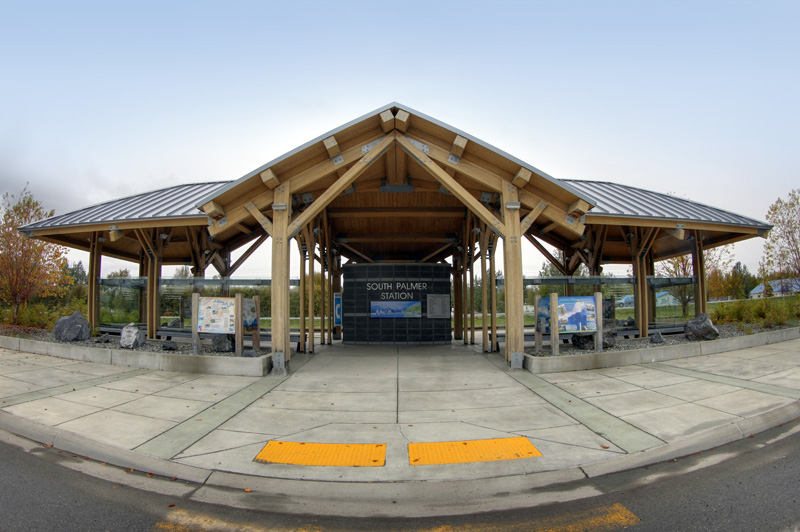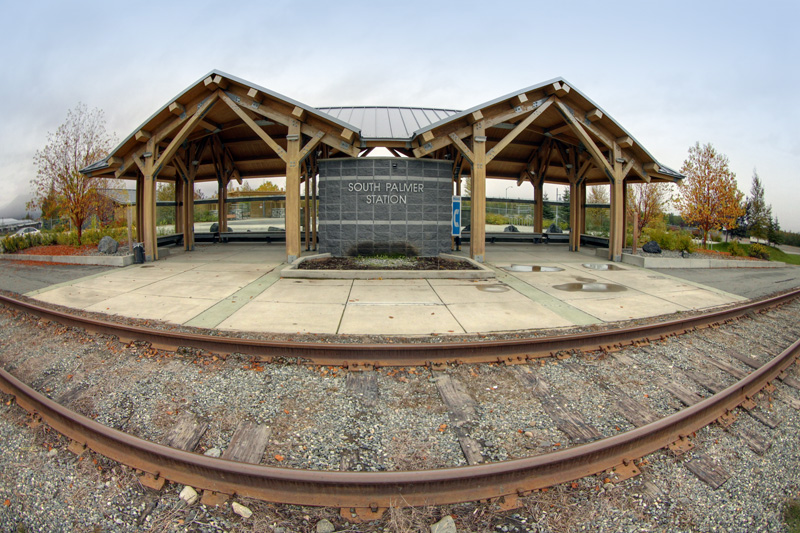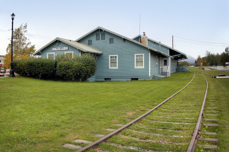 Most of the places we’ve checked out thus far on the Alaska Railroad are part of regular routes that countless passengers have traveled over. Today, however, we’re going to take a look at two of the railroad’s branches – the Palmer branch and the Anchorage Airport branch. Both routes are occasionally used for passenger service, but are not in regular scheduled service. The Alaska Railroad operates a fair train every year for the Alaska State Fair, which travels over the Palmer branch and to South Palmer station. Besides the fair and other special events, it is mostly freight that sees this branch. Beyond the branch’s useable track lies the town of Palmer, for which the branch was named. Palmer’s depot still stands, and is used as a community center. Sitting outside is a restored coal locomotive.