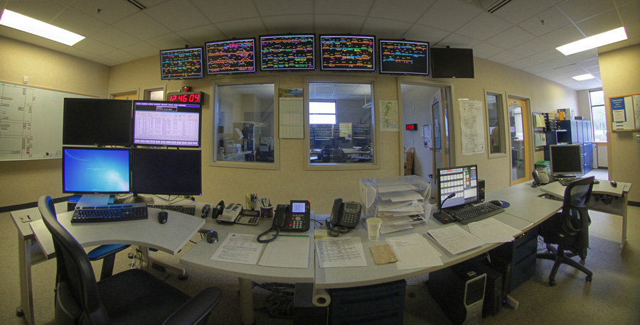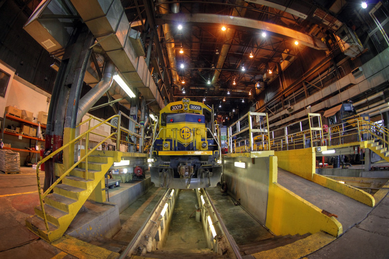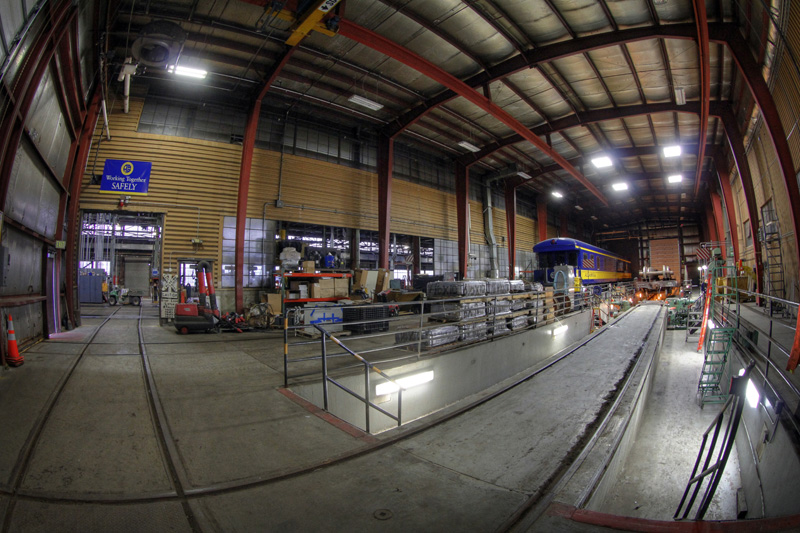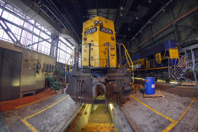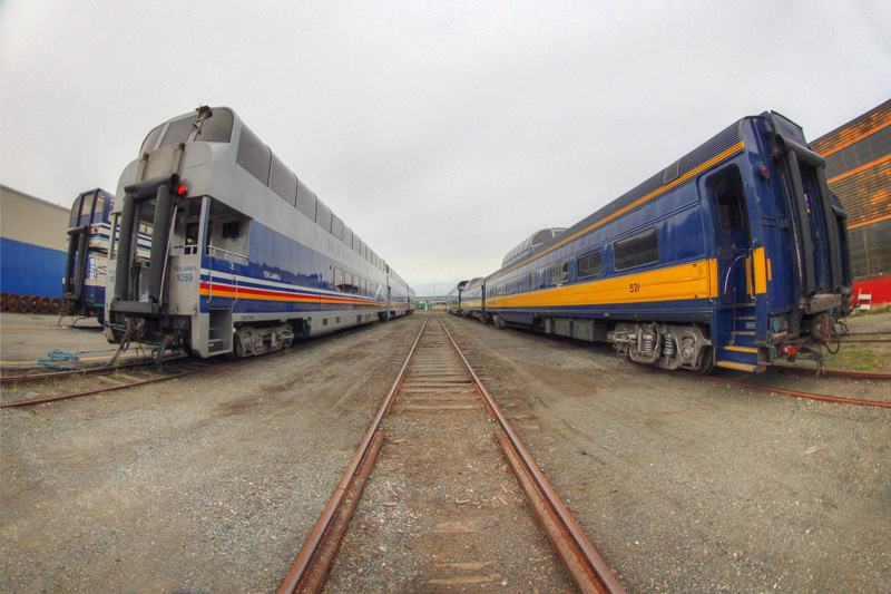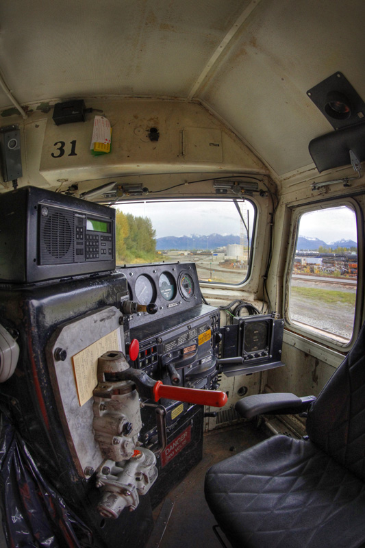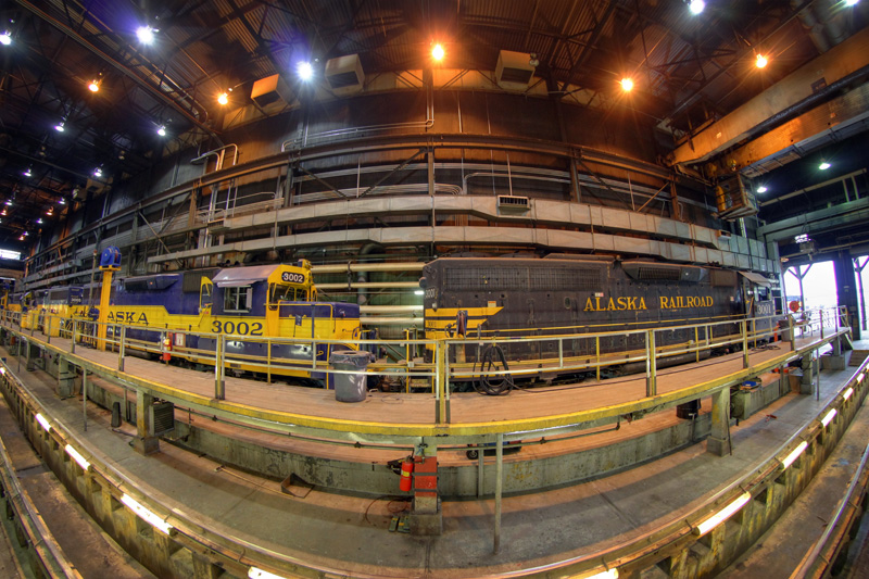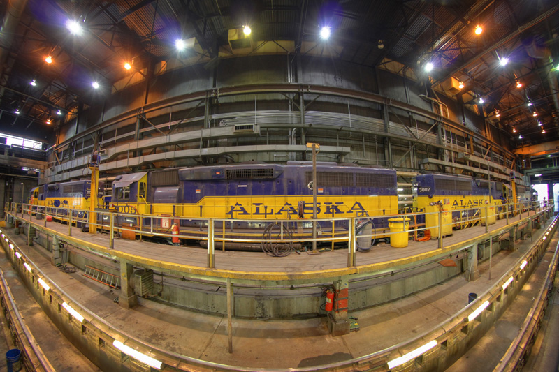 I won’t include a whole lot of commentary with this post, and I’ll let the photos speak for themselves. If you ever wanted to get a “behind the scenes” view of the Alaska Railroad, we’ll take a quick tour of their operations center, check out the view from a few of their locomotives, visit the car facilities and of course, the locomotive shops. And yes, I ran all around with my trusty fish-eye lens… because I could!