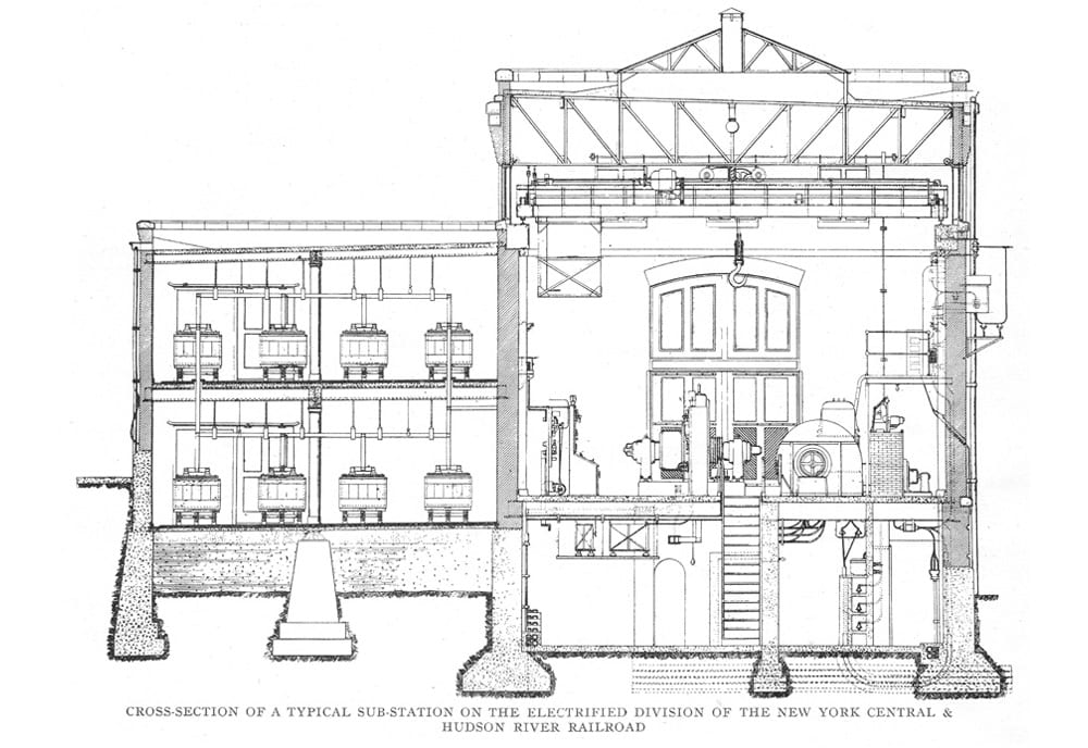 Both power stations were cross-connected, and each had an ultimate capacity of 30,000 kw. Just as Grand Central was designed to handle more traffic than the railroad was currently operating, the power stations were designed to carry train service much greater than what was being operated at the time with steam locomotives. Powered by coal, the plants were both designed to receive coal by rail or by boat, which was then delivered by conveyors to a crusher. After the coal was crushed to the necessary size, it was delivered by another conveyor to a coal bunker with a 3500 ton capacity at the top of the building. Each plant had 24 Babcock and Wilcox water tube boilers, and was designed to accommodate 6 5000kw Curtis vertical turbo-generators. The high voltage AC electricity provided by these power plants was delivered to various substations along the Harlem and Hudson Divisions through insulated cables, where it was then converted to lower voltage DC power for the third rail to power trains.