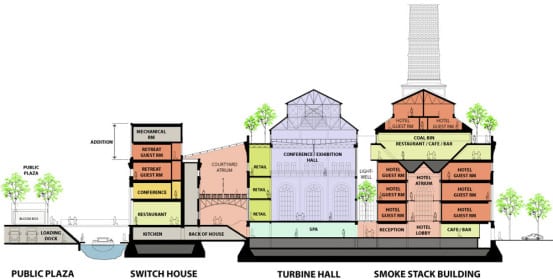 “The Plant” project looks to turn the crumbling power station into a hotel and a convention center, with a capacity of 1600 and 3500 people, respectively. The space is separated into four distinct parts – the Smokestack Building, the Great Turbine Hall, a courtyard, and the Switch House Building – all of which will be connected internally with a new corridor. The smokestack building would contain a reception area, and cafe on the ground floor, and a hotel on the upper floors. Not only will the smokestacks be preserved, plans call for meeting rooms to be constructed inside the 15’6″-diameter stacks.