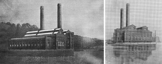 1905 sketches of the Yonkers (Glenwood) Power station (left) and Port Morris power station (right).