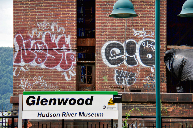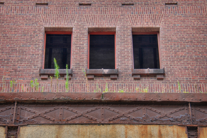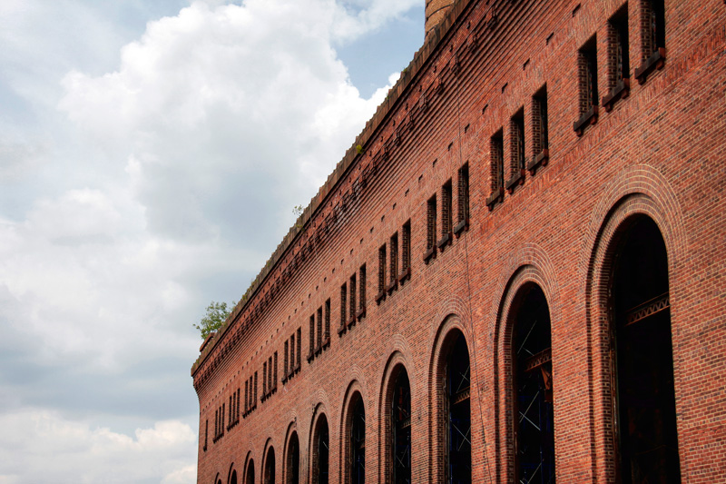Two power stations were constructed by the New York Central in 1906 – one on the Harlem Division at Port Morris (the Harlem had a short branch to Port Morris at the time), and another in the Glenwood section of Yonkers on the Hudson Division. The architecture of both, as designed by Reed and Stem, was relatively simple with brick and terra cotta on the outside. Long, arched windows provided natural light during the day, and an attractive glow along the water at night. Under that simple exterior lay an extensive framework of steel (2800 tons of steel in total), with concrete flooring, brick and tile walls, and concrete roofing slabs covered with copper. Each plant consisted of two buildings – a main building that enclosed a boiler room, coal bunker, and generating room which was 167′ wide, 237′ long, and 105′ high, and a separate swich house located about 40′ away from the main building.