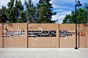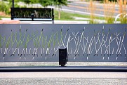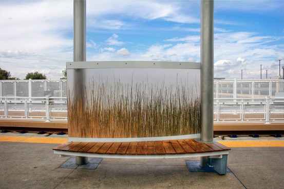 Besides the full commissioned artworks, you’ll notice that there are various pleasingly aesthetic elements found at the stations. Benches at several stations feature imagery of tall grasses on panels of layered glass. Other benches have cutouts that carry a similar theme. Concrete panels with stylized grass in relief can also be found in places along the line. All in all the new line turns out to be a nice ride, complete with nice views of downtown Denver’s skyline.