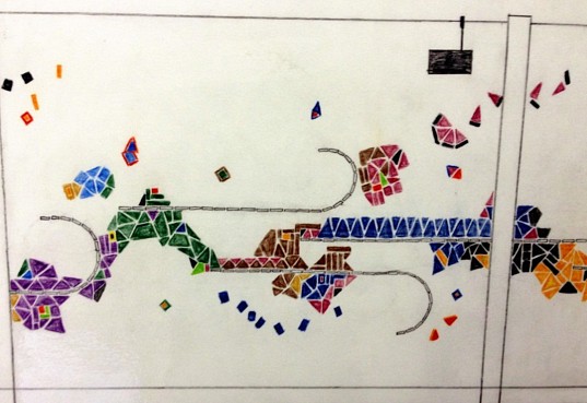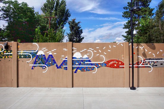 A mosaic titled The Winds of Change can be seen in the photos of the new Garrison station, created by Mike Squared Mosaics. Mike Squared Mosaics are the works of two Colorado artists – Mike Cody and Mike Juarez. The duo fire their own custom made mosaic tiles, all of which are hand-cut. The 220 foot “mosaic mural” combines tile, glass, and even pottery in a colorful and somewhat abstract portrayal of the area’s natural history.