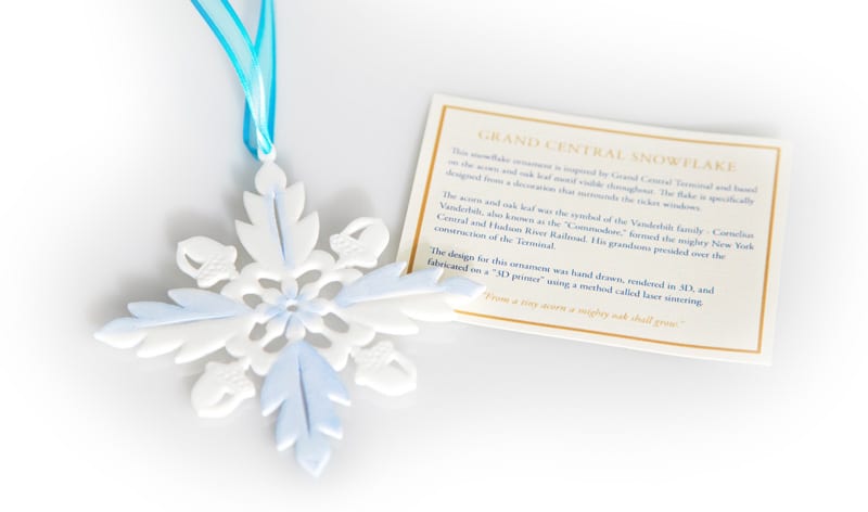 This snowflake ornament is modeled after the acorn motif found throughout Grand Central Terminal. Acorns are found throughout the Terminal as they were the adopted “crest” of the Vanderbilt family. This specific design can be found embellishing the ticket windows.
