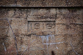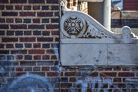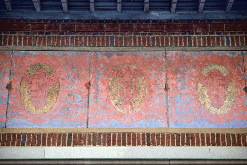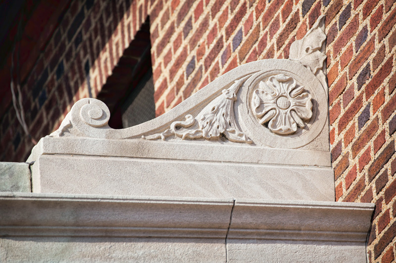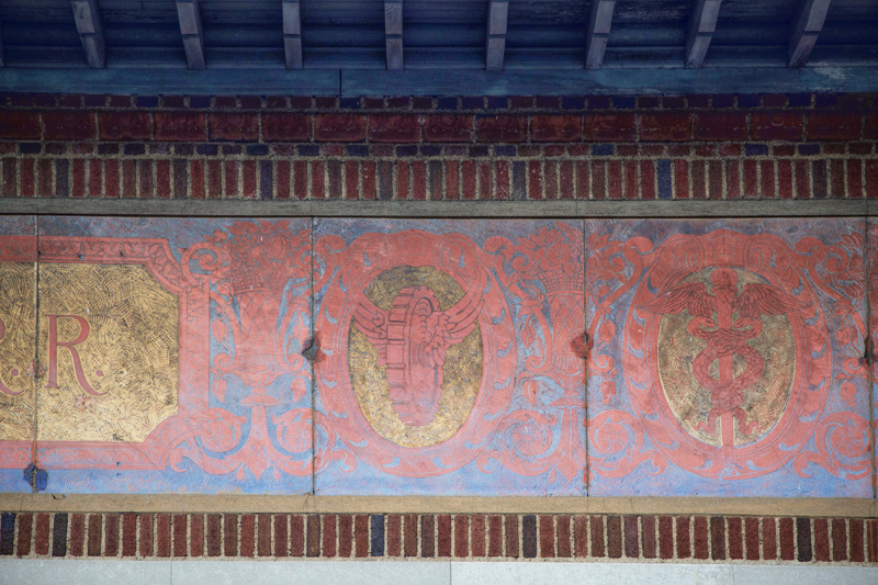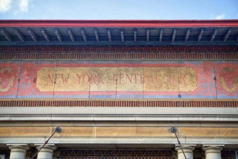 From the platform level one would hardly notice the history that surrounds this Metro-North station. A walk around the property at street level one discovers several exits long closed and covered in concrete. Behind masses of tall weeds is another former exit, the concrete marked with a 1916 date. The diamond in the rough, however, is the old station building, or rather its façade. A sgraffito panel bears the traditional symbols of transportation – the winged wheel and the caduceus – positioned between the text identifying the station as one of the New York Central Railroad. Besides this panel the adornments on the building are few, with the exception of a few sculpted flowers, surrounded by what could possibly be oak leaves.