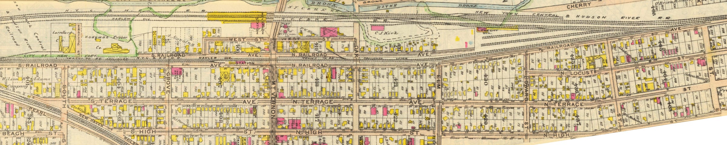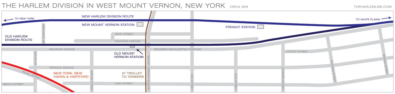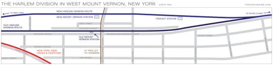 Q&d map of Mount Vernon showing the locations of the old and new stations, and how the rail line was rerouted through town. Based on a map found in the 1914 edition of the G.W. Bromley & Co. Atlas of Westchester County, via the David Rumsey Map Collection. If you want to download the high res original, which shows individual tracks and sidings click here.