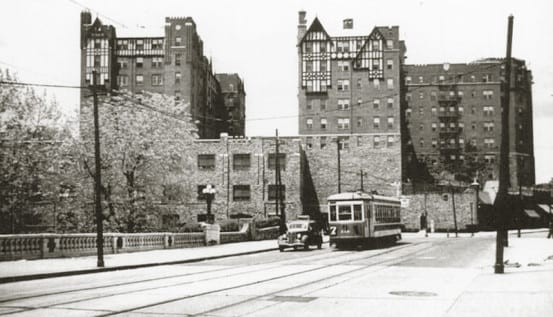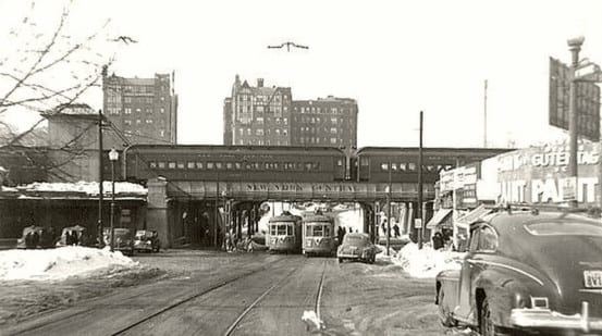 An older face of Mount Vernon – the #7 trolley line connecting Yonkers and Mount Vernon ran right next to the station. The first photo, from the book Metropolitan New York’s Third Avenue Railway System shows an eastbound trolley just west of the station. The lower photo from SoYo Sunset shows two trolleys crossing under the New York Central’s tracks, and a northbound train departing Mount Vernon station (which is at left, out of the frame).