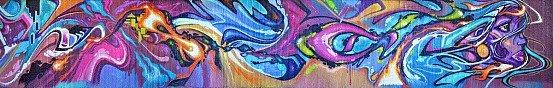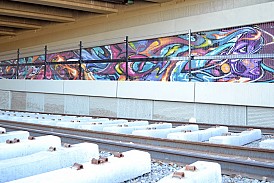 The untitled mural was painted before the new rail line was even complete – here is an in-progress view via the Art-n-Transit program, and a shot of the mural behind the rail line, still under construction, via the Guerilla Garden. At some point after the mural was completed, a handrail went up in front of it, making it a bit harder to take photos. The long panoramic shot below was stitched together by me, but using the Guerilla Garden’s photos, before the handrail was installed.