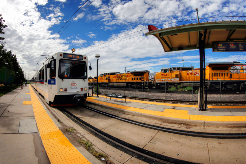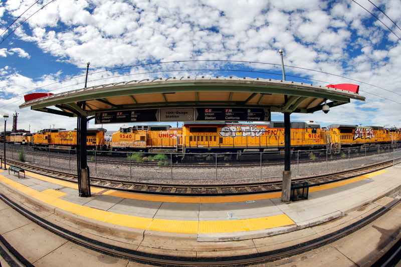 Since I am a bit under the weather this week, I figured that I would post some photos I’ve had lying around since last September, and my impromptu visit to Denver. I’ve already posted two sets of photos from Denver’s light rail (see Part 1, Part 2), and this is the final one, including some more views of the system’s newest West Rail Line. In several photos you’ll note a plethora of graffiti-covered Union Pacific locomotives – that would be the Burnham Shops, which are right behind the 10th and Osage station.