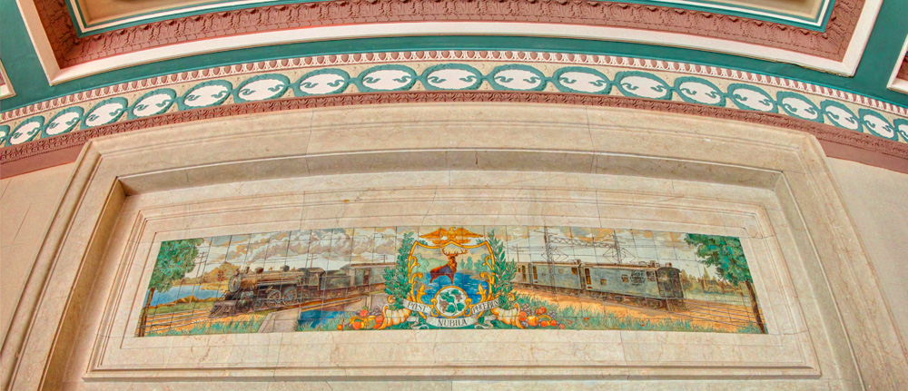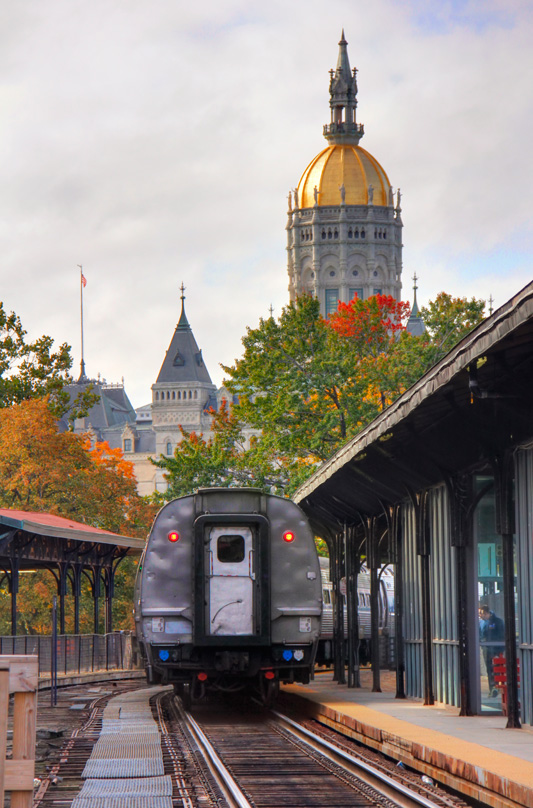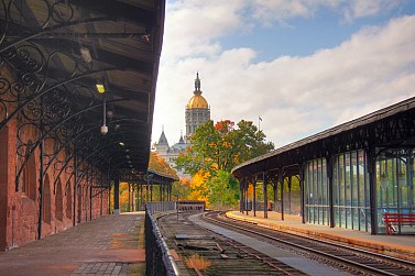 If you’re ever passing through Hartford, the old station is at least worth a look. The stonework and detailing found on the exterior is undoubtedly beautiful, only marred by a few trappings of today – you’ll find security cameras just above decorative elements, and a garish Subway logo above a once more graceful arch. Be sure to check out the artwork at the top of the steps, and keep your eyes peeled for views of the the Capitol building from the platform.