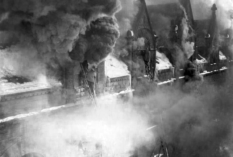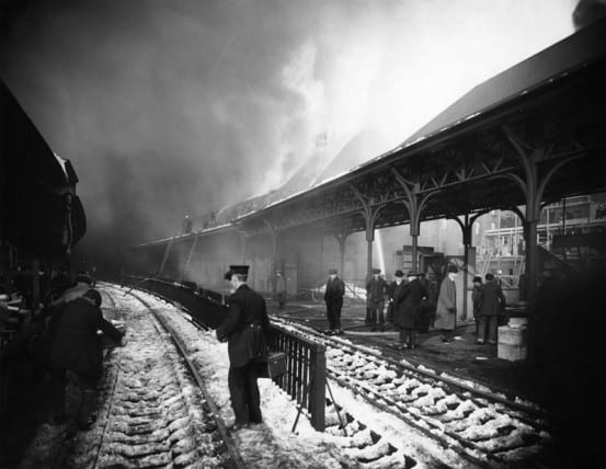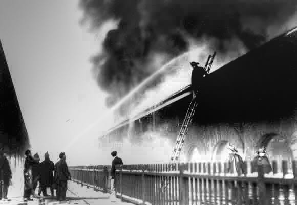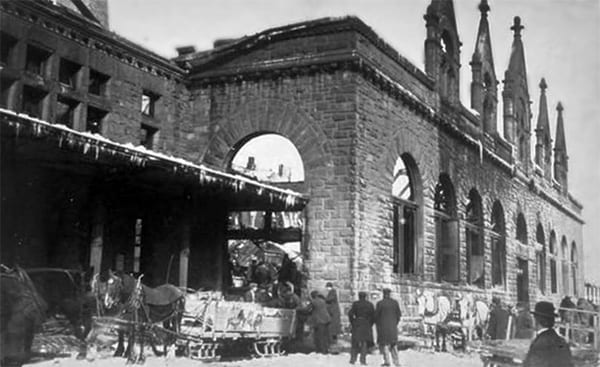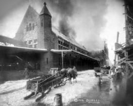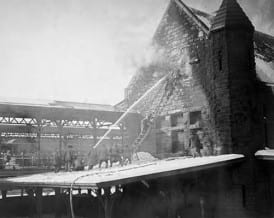 The station after the fire was put out. Note the detail on the roof that no longer exists.