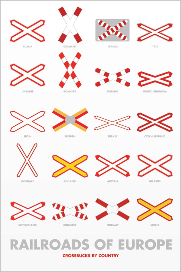 Crossbucks are are a ubiquitous part of rail systems, in the many places where trains converge with streets. Though most countries use a similar concept, the colors and proportions vary widely.