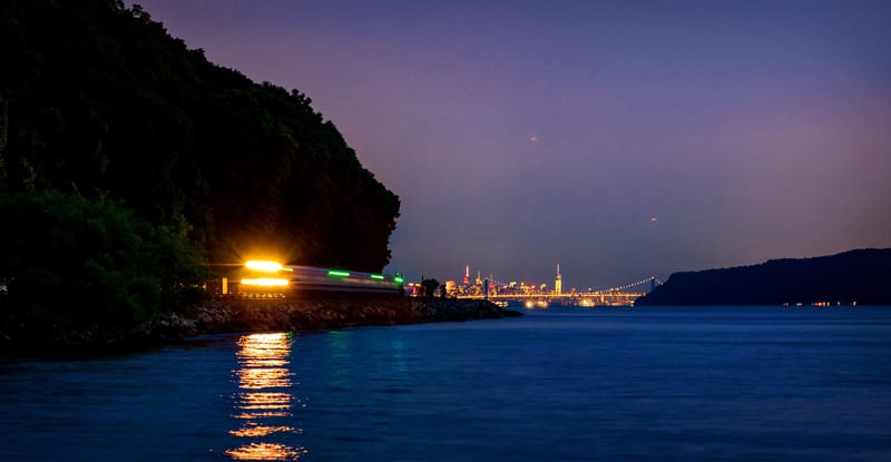 The headlight of an M7 reflects against the waters of the Hudson River at Dobbs Ferry.