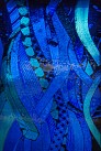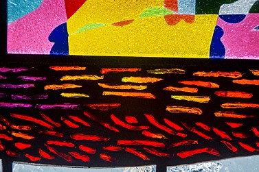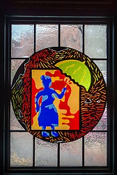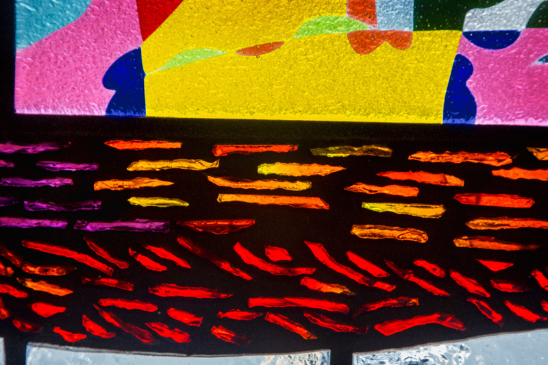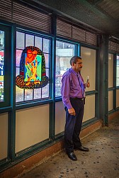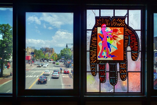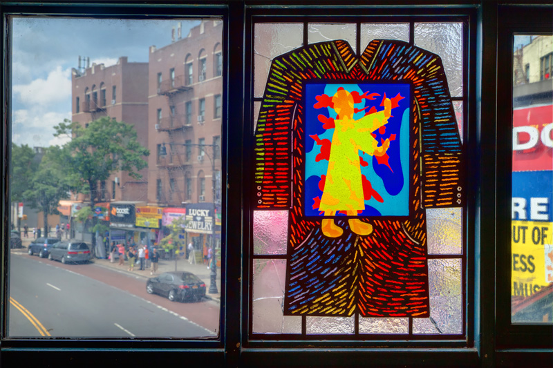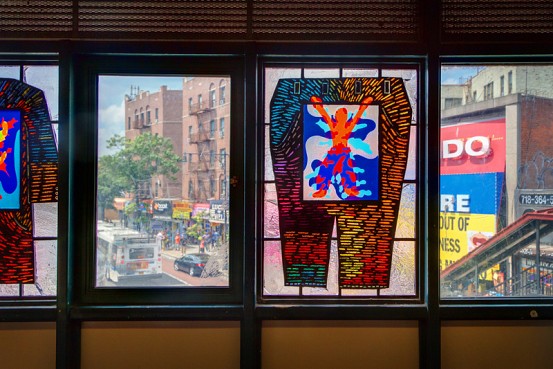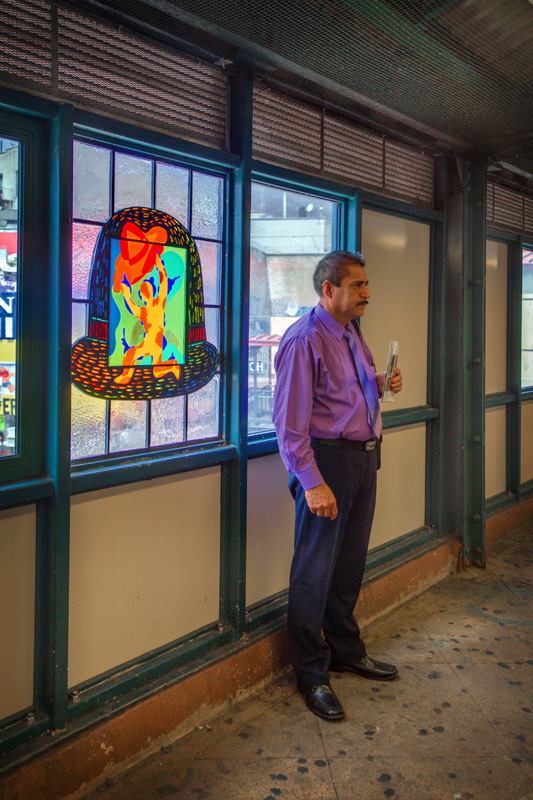 Bronx artist and architect Moses Ros is behind Fordham Road’s colorful Arts for Transit piece, located in the windows of the station’s mezzanine. Made of faceted and laminated glass arranged in between panels of regular windows, the piece allows you to see Fordham Road’s bustle, side by side with Ros’ artistic renditions of the wares one can purchase on the street.