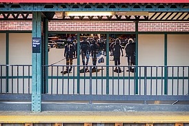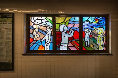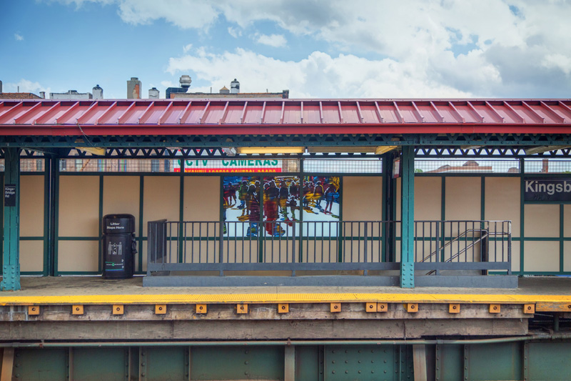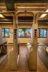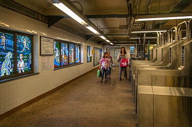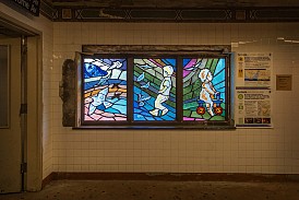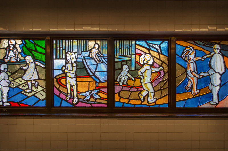 Situated at the very end of the 4 line in the Bronx, Woodlawn’s Arts for Transit piece is located below platform level by the entrance turnstiles. Surrounded by bold colors, children created from faceted glass play across multiple panels. The panels were designed by Josie Gonzalez Albright, a local painter that frequently depicts people in their everyday surroundings. The work was especially inspired by the abundance of park area that surrounds the station.
