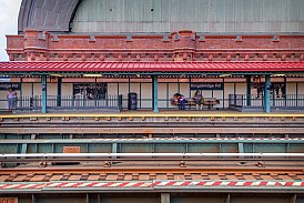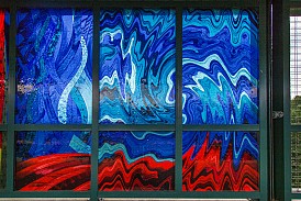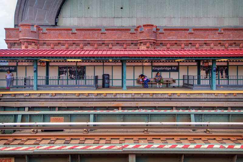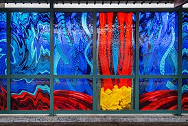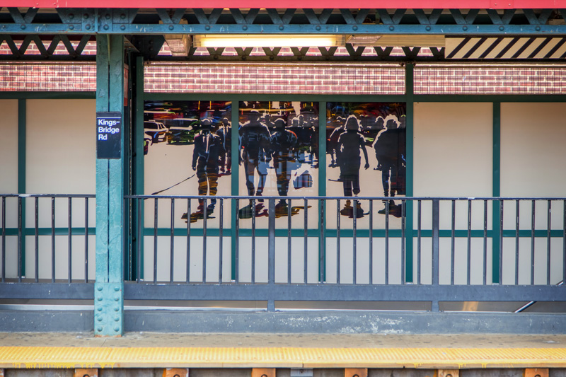From afar one may see the laminated glass panels at Kingsbridge Road and think they depict simple silhouettes, but up close viewing reveals that the simple silhouettes are in fact made of elaborate, colorful brushstrokes. Designed by New York artist that now lives and works in LA, Mario M. Muller, Urban Motif shows the crowds that typically surround the station over the passage of time through both silhouettes and shadows.