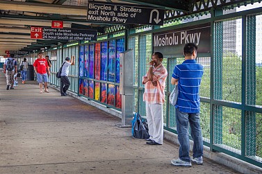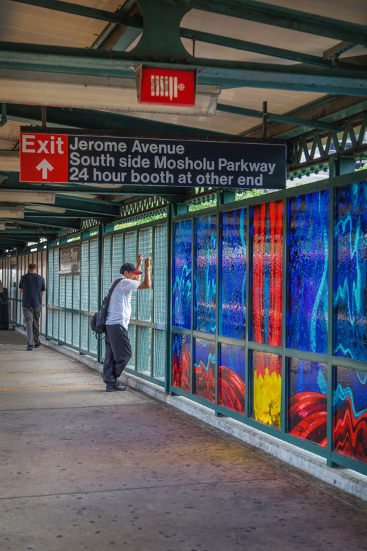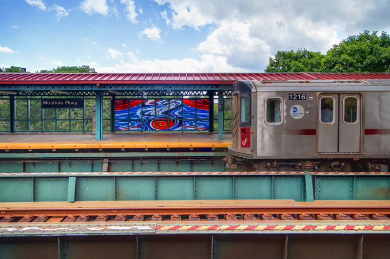 Bronx textile artist Corinne Grondahl’s bold Arts for Transit piece can be found at Mosholu Parkway station, on both sides of the platform. The work focuses on the passage of time, and changes over time, a concept derived from the original meaning of the word mosholu.