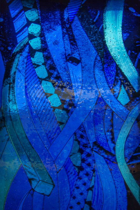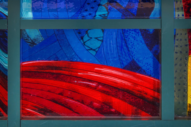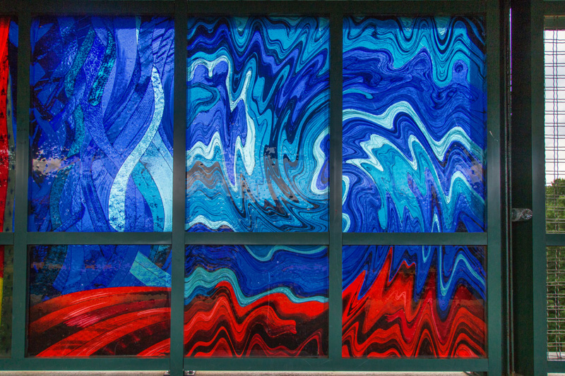 From the Algonquin language, mosholu refers to smooth stones, created by rivers flowing over rocks, and was first used to describe the nearby creek now known as Tibbetts Brook. Grondahl’s colorful swirls of reds and blues are displayed across fourteen fused glass panels, which are a part of the windscreens on both sides of the platform.