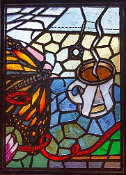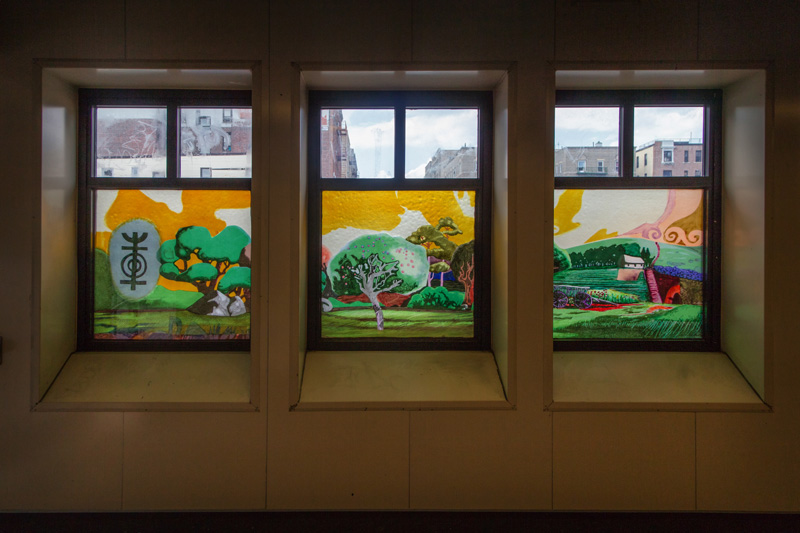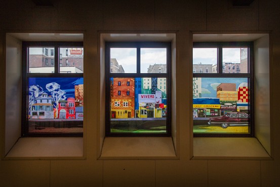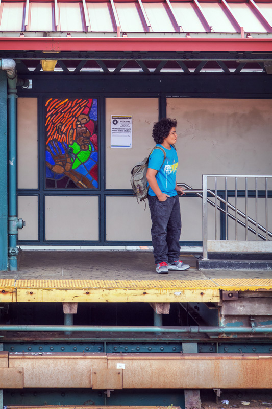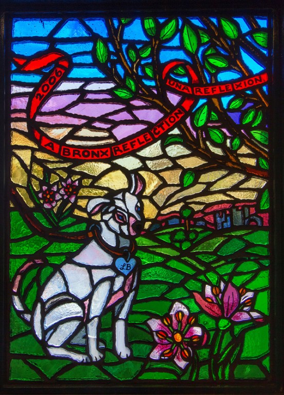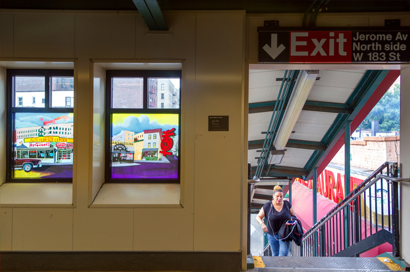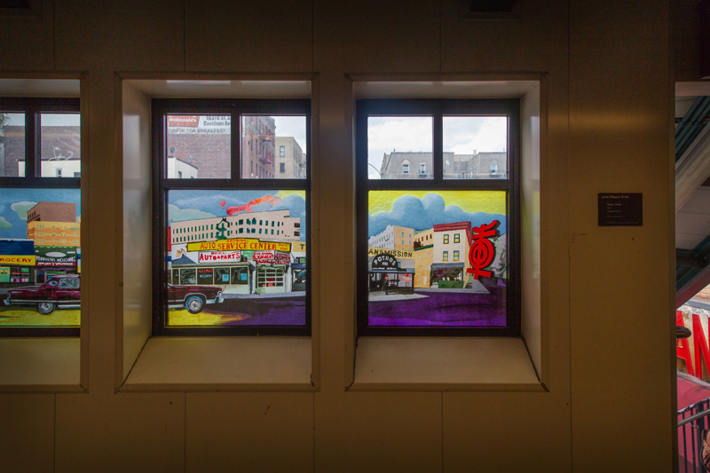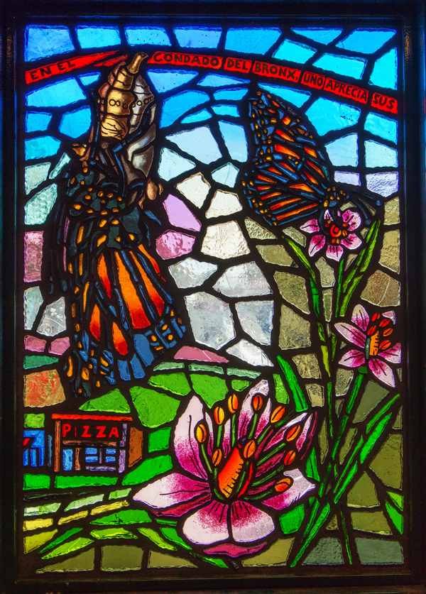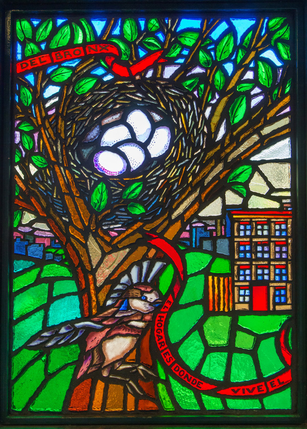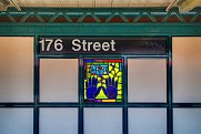 Last, but certainly not least, is “A Bronx Reflection” – definitely one of the more beautiful bits of glass on the 4 line, if not the most beautiful. Installed in the station’s lower passageway, twelve colorful panels reflect a vision of growing up in the Bronx. Featuring text in both English and Spanish, the piece depicts animals, plants, schools, shops, and churches – culminating with a view from a window, complete with a steaming mug of coffee. All of these are scenes plucked from the memories of the artist, a Chinese-American artist who grew up in the Bronx, and teaches art to high-schoolers there today.