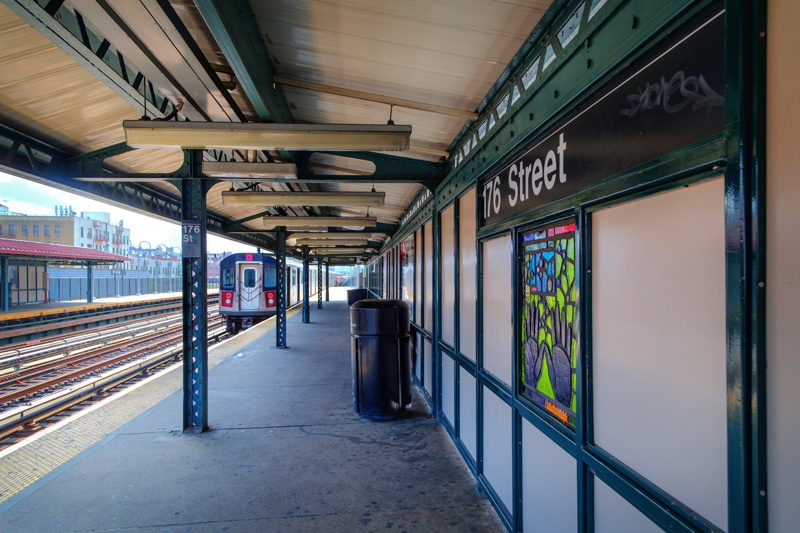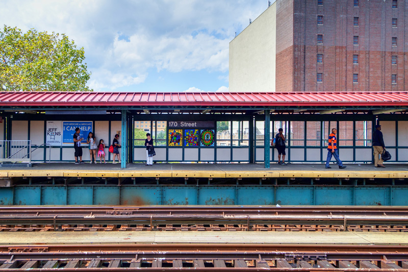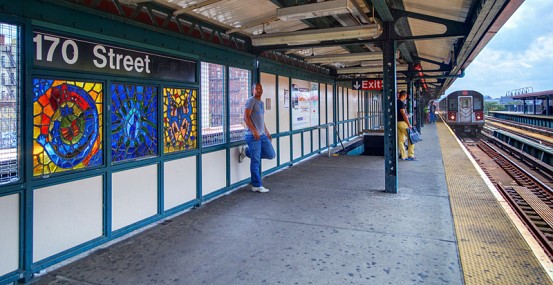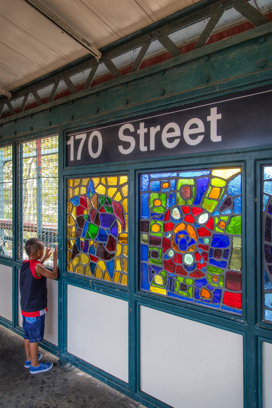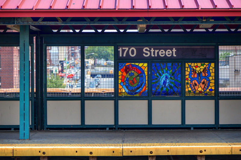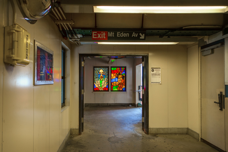 At Mount Eden Avenue you’ll find colorful faces rendered in faceted glass on both the platform and lower entrance areas to the station. While the ones on the platform are certainly nice, the lower ones really shine – passing light projects the colors of the glass onto the floor. Each face represents a specific individual, someone known to the artist, and symbolizes the uniqueness of each rider that passes by.